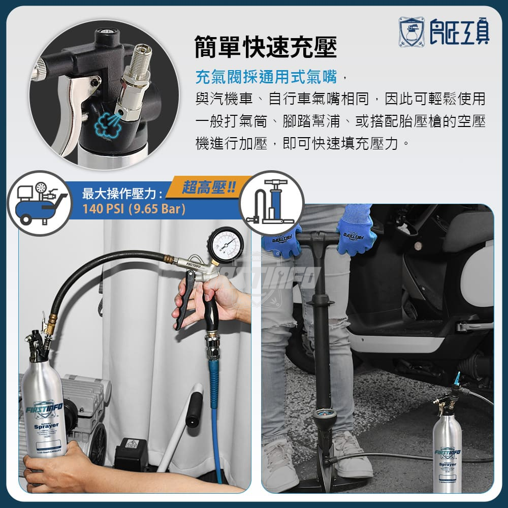- 提供安全閥設計,已預先設定在140 PSI(9.65Bar),灌飽即灌不進去,不用擔心灌太飽,可安心操作使用。